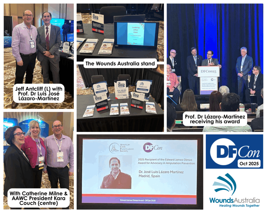 AAWC is a valued Wounds Australia affiliate and our CEO Jeff Antcliff recently met Ms Couch at DFCon 2025 in Anaheim, California, to advance plans for joint research. They are pictured below alongside our final international keynote, who received the 2025 Edward James Olmos Award for Advocacy for Amputation Prevention.